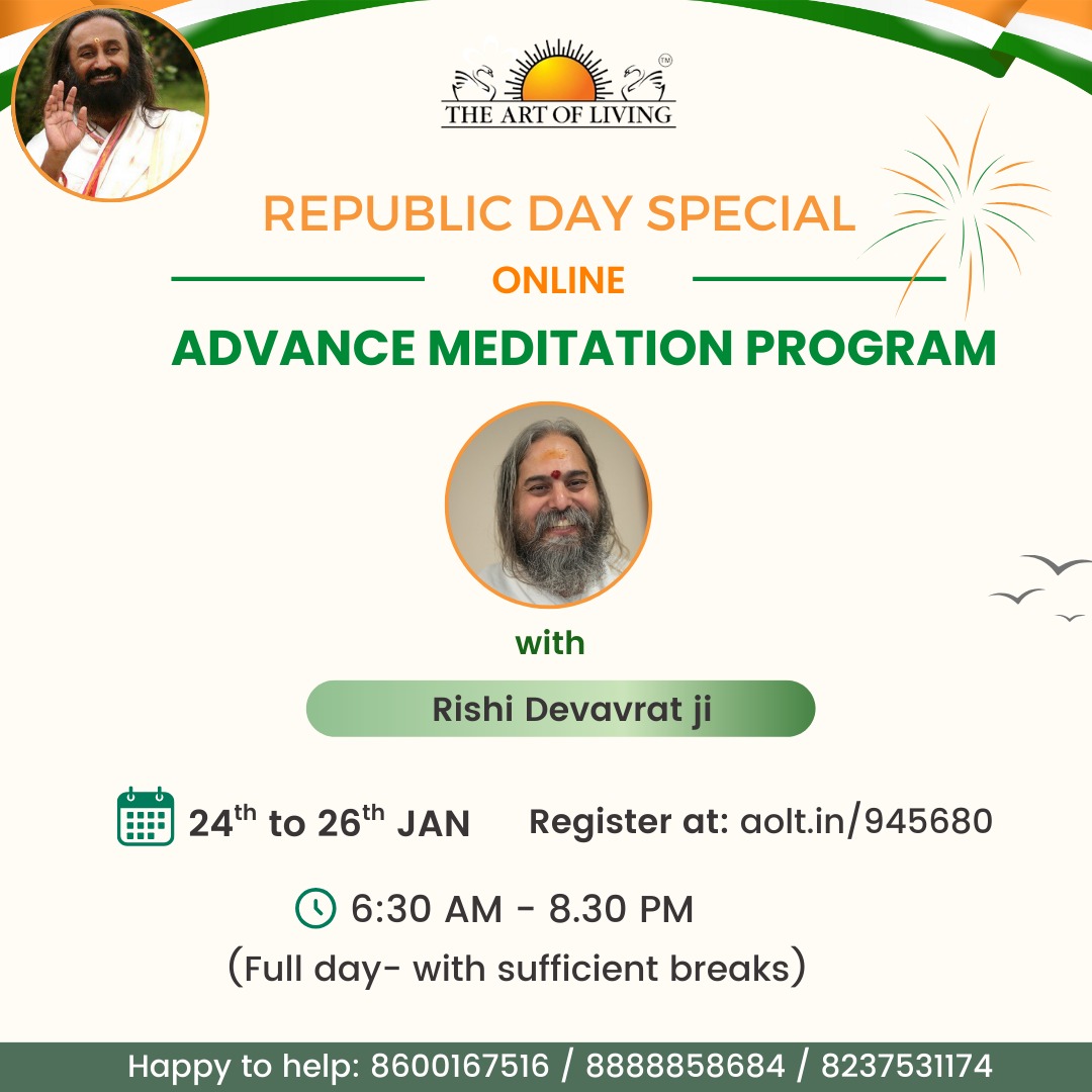 | 24 Jan – 26 Jan 2026 | Advance Meditation Program (Republic Day Special) | Online Timings: 6:30AM – 08:00AM, 10:00AM – 12:30PM, 2:15PM – 05:30PM, 7:30PM – 08:30PM | Register Now | 8600167516 | 8888858684 | 9284321916 |